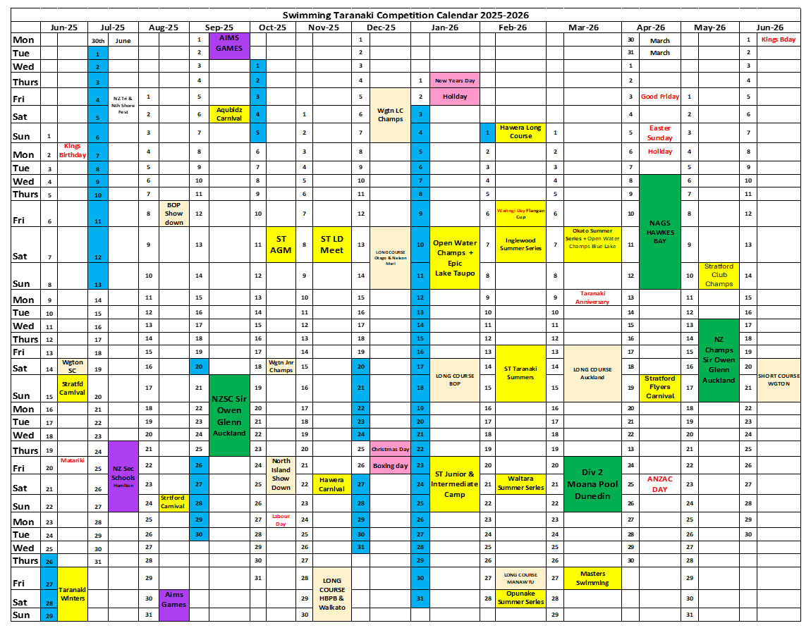Below is the 2025 - 2026 swimming year calendar. This is subject to changes from clubs for meet dates so please contact us to confirm about a club meet if you are unsure or need confirmation.